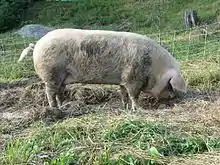 The Gloucestershire Old Spots (also "Gloucester, Gloucester Old Spot, Gloucestershire Old Spot"[2] or simply "Old Spots"[3]) is an English breed of pig which is predominantly white with black spots. It is named after the county of Gloucestershire. The Gloucestershire Old Spots pig is known for its docility, intelligence, prolificity, and hardiness.[4] Boars reach a mature weight of 600 lb (272 kg) and sows 500 lb (227 kg). The pigs are white with clearly defined black (not blue) spots. There must be at least one spot on the body to be accepted in the registry. The breed's maternal skills enable it to raise large litters of piglets on pasture. Its disposition and self‑sufficiency should make it attractive for farmers raising pasture pigs and those who want to add pigs to diversified operations.