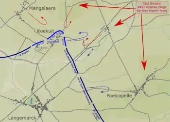 On 21 October, during the Battle of Langemarck, the opening engagement of the First Battle of Ypres, 1st Battalion occupied a salient around the village of Langemarck, nearly 5 miles (8.0 km) north of Ypres. Elements of C Company commanded by Lieutenant Wetherall, defending the tip of the salient at the hamlet of Koekuit, were particularly hard pressed, beating back repeated attacks until ordered to withdraw after dark. For his stubborn defence Wetherall was awarded the MC.[40][41][42]