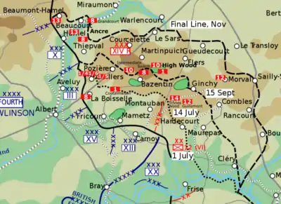On 16 July, during the Battle of Bazentin (14–17 July), the Glosters' 1st Battalion was part of the 3rd Brigade advance from Contalmaison in an intricate night attack which occupied the German front-line and support trenches northwest of Bazentin-le-Petit Wood. The attack cost the battalion three killed and 25 wounded.[77][78] The same day, the regiment's three front-line territorial battalions moved into the line west of Ovillers, 2.5 miles (4.0 km) to the west of Bazentin-le-Petit. Alongside 1/7th Battalion Worcestershire Regiment, 1/4th Battalion fought for two days to capture first the German trenches west and northwest of Ovillers and then, along with troops of the 25th Division who were attacking from the south, the village itself. The fighting cost the battalion 275 men.[79][80] 1/5th and 1/6th Battalions were in action between 19 and 23 July, making local attacks against strongpoints to the north and northeast. These actions were costly affairs and in just one example on 21 July 1/6th Battalion lost 3 officers and 101 other ranks.[81]