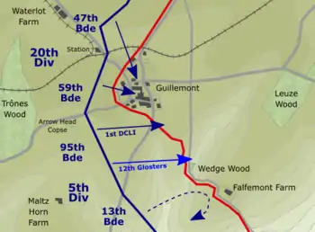 The village of Guillemont lay on the British right flank, close to the boundary with the French Sixth Army. The British Fourth Army had advanced close to the village in mid July during the Battle of Bazentin, but although several attacks in July and August pushed the front line closer to the village, it remained in German hands until it finally fell to the British 20th Division on 3 September during the Battle of Guillemont (3–6 September).[64]