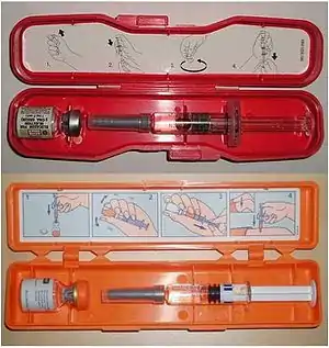 Glucagon must be reconstituted using a multi-step process that requires the administrator to use a prepared syringe containing an inactive compound and a sealed dosage bottle of glucagon. After the contents of the syringe are injected into the glucagon bottle, the administrator must determine if the reconstitution appears appropriate: clear with a water-like consistency. This is a subjective assessment. The solution must be drawn back into the syringe, the injection site cleaned with alcohol, and then injected with sufficient force into fatty tissue. Individuals who have not performed this procedure before are at a disadvantage increased by the potential for severe hypoglycemia [4]