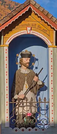 The shield is party per pale: the first part represents half Tyrolean Eagle on argent; the second is tierced per fess of sable, argent and gules. The eagle represents the membership of the village to the Tyrol, while the colors sable, argent and gules are those of the city. The emblem was granted in 1528 by Ferdinand I, Holy Roman Emperor.[4]