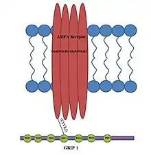 Glutamate receptor-interacting protein (GRIP) refers to either a family of proteins that bind to the glutamate receptor or specifically to the GRIP1 protein within this family. Proteins in the glutamate receptor-interacting protein (GRIP) family have been shown to interact with GluR2, a common subunit in the AMPA receptor.[1] This subunit also interacts with other proteins such as protein interacting with C-kinase1 (PICK1) and N-ethylmaleimide-sensitive fusion protein (NSF). Studies have begun to elucidate its function; however, much is still to be learned about these proteins.
