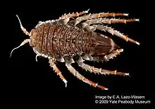 Glyptonotus antarcticus has a typical maximum length of 9 cm (3.5 in),[2] but may rarely reach up to 20 cm (8 in).[3][4] This is large for an isopod, most of which are between 0.5 and 1.5 cm (0.2–0.6 in) in length.[5] It has two pairs of compound eyes, a large pair on the dorsal surface and a smaller pair on the ventral surface. Glyptonotus antarticus has only five ommatidia, which is unusual for crustaceans and insects.[6] It is thought that the latter are useful when the animal is swimming, which it does in an upside-down position.[7] With the exception of the eyes, certain mouthparts and feet, the whole surface of the animal has minute cuticular outgrowths of feathery hairs and knobbly scales. It is thought that these may help to prevent attachment of Foraminifera and marine larval organisms on the body surface.[8]