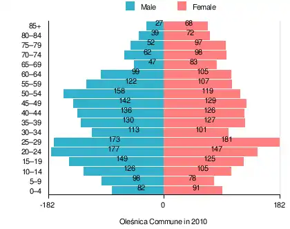 According to the 2011 Poland census, there were 3,891 people residing in Oleśnica Commune, of whom 49.7% were male and 50.3% were female. In the commune, the population was spread out, with 19.3% under the age of 18, 38.9% from 18 to 44, 22.5% from 45 to 64, and 19.3% who were 65 years of age or older.[1]