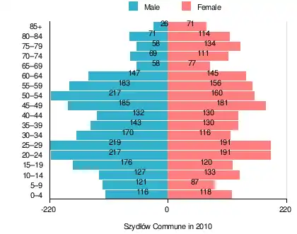 According to the 2011 Poland census, there were 4,800 people residing in Szydłów Commune, of whom 50.7% were male and 49.3% were female. In the commune, the population was spread out, with 18.1% under the age of 18, 36.8% from 18 to 44, 25.6% from 45 to 64, and 19.5% who were 65 years of age or older.[1]