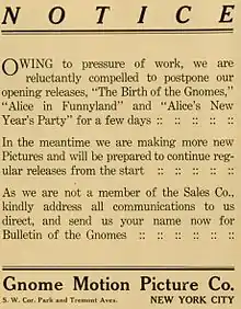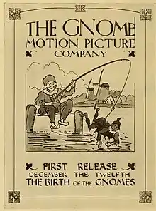 The company's lead actress was Mildred Hutchinson and employed its staff to produce stories about fictional gnomes, specifically for child audiences.[1] Hutchinson was a seasoned child actress at the time of the productions who had credits working with Edison, Vitagraph and Melies the age of six.[1] Records surrounding the release suggest that Alice in Funnyland, The Birth of the Gnomes and Alice's New Year's Party were never released. The venture ultimately failed and the City of New York sued Frederick Kalmbach, the company treasurer, for unpaid taxes on an assessment of $3,000. Kalmbach said that the Gnome Motion Picture Company was no longer conducting business when the assessment was made and the case was dismissed by the judge in 1918.[3] The last record of the Gnome Motion Picture Company in trade publications, in both announcements and advertisements, comes from a January 14 issue of Moving Picture World which announces all three of the films would be delayed for a "few days".[4] The American Film Institute still identifies all three films as having been released in January 1911 by Gnome.[5]