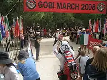 In 2008, the Gobi March took place just one month after the devastating earthquake in Sichuan Province on 12 May, so that year RacingThePlanet put together a special auction whereby friends and families of competitors could bid to buy a hot shower for three competitors at the end of the 90 km Stage 5 of the event. An unheard of and never-to-be-repeated luxury. The auction raised almost US$30,000 for the Red Cross disaster fund.[12]