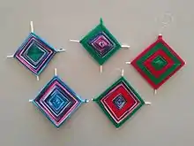 In other parts of the Americas, artisans weave complicated or variegated versions of the traditional Ojos de Dios, selling them as decorations or religious objects.[1] There has also been a huge increase in the use of Ojos de Dios as an easy and fun craft for children.