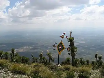 Negrín states that: "The votive nierika is generally a round offering, symbolizing an ancestor and prayer offerings sanctified by the blood of a sacrificed animal."[4] Nierika as a ritual object may be attached to votive arrows with bamboo and yarn, or wood-and-wax-embedded objects. Similarly, Lumholtz states that the nierika "evokes an ancestor, thanks it with blood offerings, and invokes its favors." The nierika may take different forms and fabrication may differ greatly: a small round or square tablet with a hole in the center covered on one or both sides with a mixture of beeswax and pine resin into which threads of yarn are pressed; when the image is not round, it may be considered a resting mat for the ancestors, or a prayer mat or itari.