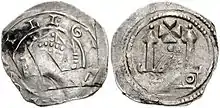 ![]() denaro with Godfrey standing facing, holding staff and book of Gospels with lettering | |