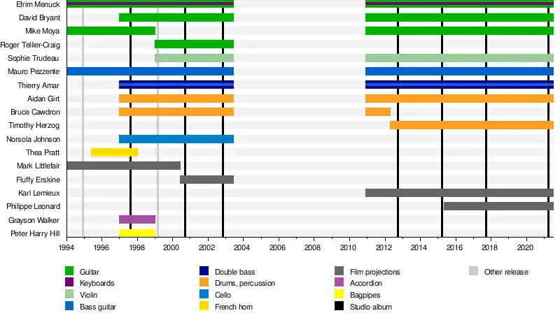 The band quickly expanded and continued to perform live. According to Menuck, joining the group was quite simple: "It was like if anyone knew anybody who played an instrument and seemed like an okay person, they would sort of join up."[16] In short order, the group's numbers ebbed and flowed. Local musicians would often join the band for a handful of performances, then depart. The revolving door nature of the group's membership frequently caused it strain before the release of F♯ A♯ ∞.[16] After that release, the group stabilized around a nine-person lineup with Menuck, Moya and David Bryant on guitars, Pezzente and Thierry Amar on bass guitars, Aidan Girt and Bruce Cawdron on drums, and Sophie Trudeau and Norsola Johnson on violin and cello respectively. Moya would depart in 1998 to focus on HṚṢṬA, being replaced by Roger Tellier-Craig of Fly Pan Am.[17]