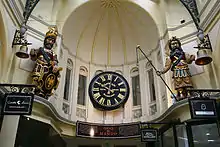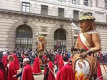 The Lord Mayor's account of Gogmagog says that the Roman Emperor Diocletian had thirty-three wicked daughters. He found thirty-three husbands for them to curb their wicked ways; they chafed at this, and under the leadership of the eldest sister, Alba, they murdered their husbands. For this crime they were set adrift at sea; they washed ashore on a windswept island, which they named "Albion"—after Alba. Here they coupled with demons and gave birth to a race of giants, whose descendants included Gog and Magog.[18] The effigies of two giants were recorded in 1558 at the coronation of Elizabeth I and were described as "Gogmagot the Albion" and "Corineus the Britain". These, or similar figures, made of "wickerwork and pasteboard" made regular appearances in the Lord Mayor's Show thereafter, although they became known as Gog and Magog over the years. New figures were carved from pine in 1709 by Captain Richard Saunders and displayed in the Guildhall until 1940 when they were destroyed in an air-raid; they were replaced by David Evans in 1953.[19]