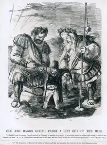 Under the influence of Geoffrey's Gogmagog (Goemagot), Gos et Magos, the French rendition of "Gog and Magog", were recast in the role of enemies defeated by the giant Gargantua, and taken prisoner to King Arthur who held court in London in Rabelais's Gargantua (1534).[lower-alpha 1][20][21] Gargantua's father Pantagruel also had an ancestor named Gemmagog,[22] whose name was also a corruption of "Gog and Magog", influenced by the British legend.[23][24]
