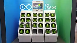 The Gogoro Network is a modular battery swapping infrastructure designed to be deployed in cities for electric refueling of two wheel vehicles like scooters, mopeds and motorcycles. Riders would be able to swap out depleted batteries at a network of kiosks called GoStations for a monthly subscription fee.[12] According to Gogoro, as of April 2021 in its pilot market of Taiwan, Gogoro Network had 370,000 riders and managed more than 175 million battery swaps, 265,000 per day, through its 2,000 GoStations.[13]