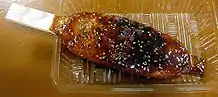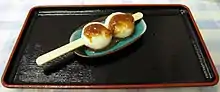 Goheimochi (Japanese: 五平餅) is a type of mochi made in the Chubu region of central Japan, specifically in Nagano, Gifu, and Aichi prefectures.[1] Unlike regular mochi it is coated with a type of sweet and sour sauce, usually composed of sugar, soy sauce, and mirin.[2] The mochi is then skewered and grilled. Goheimochi is typically made in one of two shapes: Waraji is shaped like a traditional sandal and rounded mochi is served on a skewer.[3] The mochi is usually only half-cooked so that some grains of rice remain, the rice is usually short-grain rice giving goheimochi a firmer texture compared to standard mochi.[4]