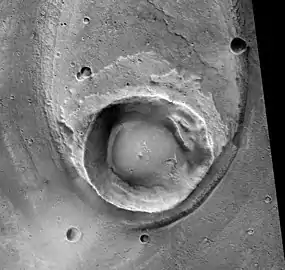 ![]() Tear-drop shaped islands caused by flood waters from Ares Vallis, as seen by Viking Orbiter. The islands were formed by the ejecta of Lod, Bok, and Gold craters. | |