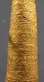 Including the part now missing, the 'hat' would have weighed about 330 g. Like its counterparts, it was hammered from a single piece of gold, decorated in the repoussé technique with bands and rows of symbols, had a somewhat convex, cap-like, lower portion and was originally equipped with a 'brim', which was probably lost during its recovery. Like the Berlin example, it was reinforced by one or several bronze rings near the bottom.