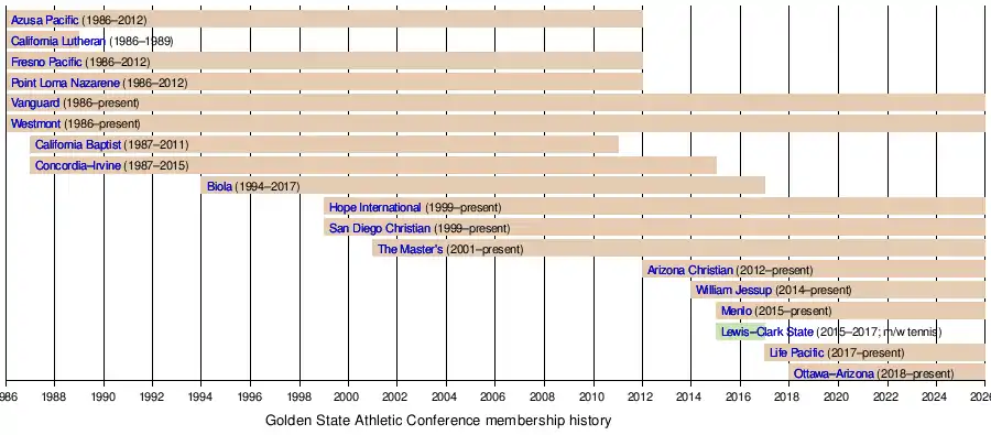 The Golden State Athletic Conference was formed in the fall of 1986, with Azusa Pacific University, California Lutheran University, Fresno Pacific University, Point Loma Nazarene University, Vanguard University and Westmont College as the charter members. California Baptist University and Concordia University joined the GSAC in the fall of the following year (1987). Cal Lutheran left the GSAC after the spring of 1989. Biola University joined the GSAC in the fall of 1994. Hope International University and San Diego Christian College joined the GSAC in the fall of 1999. The Master's University, joined the GSAC in the fall of 2001. Lewis–Clark State College of Lewiston, Idaho joined the GSAC as an affiliate member for men's and women's tennis in 2016.