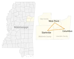 The Golden Triangle (GTR) is a region in the east central portion of the U.S. state of Mississippi. The "triangle" is formed by the cities of Columbus, Starkville, and West Point but the region is often more broadly-defined to include all of Clay, Lowndes, and Oktibbeha counties and sometimes additional surrounding communities and counties as well.[1] The term was used as a marketing strategy in the 1960s[2][3] to promote economic development in the region and encourage additional cooperation between local communities in attracting investment,[4][5] although the term was in use by 1939.[6]