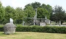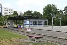 The Goldschmiedplatz is a multifunctional open space for leisure and residential activities. The centre is formed by the Blauer Punkt (Blue Point), the 25 m² tram house managed by a residents initiative of the Diakonie Hasenbergl with the roofing of the former stop. A number of private and public events take place here, such as a regular flea markets or the Hasenbergl-Nord residents get-together. There is also a barbecue area, a viewing platform and a climbing playground for children. There is also a community garden supervised by Green City. For sporting activities, a volleyball court, table tennis, two chess fields, a boules court, a summer curling track and a large skate park are integrated into the surrounding park. Here you will also find a sculpture by Hanns Goebl and the Hasenbergl Monument, which commemorates the electoral hunt in the 18th century.[4][5][6]