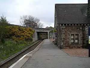 The former goods yard is to the south of the station. The station was host to a LMS caravan from 1935 to 1939.[8] A camping coach was also positioned here by the Scottish Region from 1957 to 1959 and 1964, no coaches were at the station in 1960 and 1961, then a Pullman camping coach was here in 1962, 1963 and 1965 and finally two ordinary coaches were here in 1966 and 1967.[9]