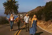 Gone West was formed in 2018 and is composed of Colbie Caillat, Justin Kawika Young, Jason Reeves and his wife Nelly Joy,[3] and was formed following the four touring together in support of Caillat's The Malibu Sessions. The band is based out of Nashville, Tennessee, and gets its name from the fact that its four members all hail from states (Reeves from Iowa, Joy from Texas, Caillat from California, and Young from Hawaii) west of Tennessee,[4] which was the inspiration for the band's "autobiographical theme song" and titular track "Gone West."[5] All of its members had previous experience in the music industry as recording artists and songwriters: Caillat as a Grammy-winning folk pop artist, Young as an artist in the contemporary Hawaiian music scene, Reeves as a songwriter of some of Caillat's biggest hits and an indie artist, and Nelly Joy as one half of country duo the JaneDear girls.