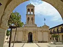 Dedicated to the Assumption of the Virgin (feast day: August 15), the monastery was founded in the 9th century and was originally dedicated to St. George.[2] It was formerly situated at Menies, on the ruins of the ancient temple of Artemis Britomartis (Diktynna).[2] The monastery was built in the 13th century adjacent to a cemetery, but it was rebuilt between 1618 and 1634 in its present location, with Venetian influences in its architectural design and adornments.[3] The distinctive fountain in front of the monastery's entrance was built in 1708, and the belfry in 1849.[3]