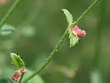 It is an erect perennial herb, woody at the base, 30–40 cm tall and 20–30 cm wide.[9] Its stems are 4-angled in cross section. Leaves are opposite and ovate, with toothed margins and 7–22 mm long. They have a dark green upper surface and a lighter undersurface, stems are often reddish.[9] Both the leaves and stems have stiff, spreading hairs.[6] Flowers are small and solitary, occurring in pairs of bracts in the leaf axils along the lower section of the flowering stem.[10] They are carried in racemes at the end of the stem.[11] Bracts are green and fleshy, petals are green to reddish. Plants are monoecious,[11] and flowering occurs from October to January.[12] Fruit is an ovoid, silver-grey ribbed nut, about 1.5 mm long.[13]