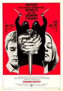 Goodbye Gemini (also released as Twinsanity)[2][3] is a 1970 British psychological horror film directed by Alan Gibson and starring Judy Geeson, Michael Redgrave, and Martin Potter. Based on the novel Ask Agamemnon by Jenni Hall,[4] it concerns a pair of unusually close fraternal twins, Jacki and Julian, discovering Swinging London while home on Spring Break. Their experiences complicate the pair's relationship, which is already strained due to Julian's incestuous fascination with his sister, which he sees as a natural manifestation of what he believes to be the pair's hive-minded nature.