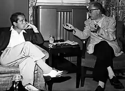 By this time, however, Ace began writing for other performers, including Milton Berle, Perry Como, Danny Kaye, Robert Q. Lewis, and Bob Newhart.[50][51] He would be nominated for Emmy Awards twice during his term as Como's head writer, in 1956 and 1959.[52][53] Ace rationalized his work by saying, "I'm not in television. I'm with Perry Como."[54] Perhaps his best turn of writing in these years, however, was his collaboration with Frank Wilson on The Big Show, considered NBC's last-gasp attempt to keep classic radio alive. This 90-minute variety program was hosted by Tallulah Bankhead and featured a rotating cast that included some of America's and the world's greatest entertainers, including Fred Allen, Groucho Marx, Jimmy Durante, Joan Davis, Bob Hope, Louis Armstrong, George Jessel, Ethel Merman, José Ferrer, Ed Wynn, Lauritz Melchior, Ezio Pinza, Édith Piaf, Ginger Rogers, Ethel Barrymore, Phil Silvers, Benny Goodman, and Danny Thomas.[13] The show was marked by Ace's wry style, adapted to Bankhead's diva-blunt style.[55] Ace said years later that one of his secrets was isolating particular interests of the guests – for example, Ginger Rogers' passion for playing golf – and writing comic routines around those interests.