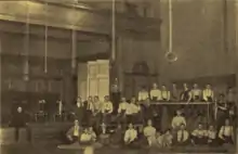 The gymnasium had a floor space 40 by 46 feet (12 m × 14 m). The apparatus was so arranged that it could be easily removed to change the gymnasium into an audience room with a seating capacity of about 300. A stage and two dressing rooms provided for entertainments.[4]