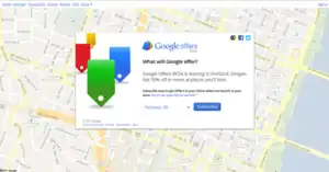 Google Offers was a service offering discounts and coupons. Initially, it was a deal of the day website similar to Groupon, but it later changed focus. Rather than a small number of prepaid offers, it instead offered many smaller discounts. It additionally integrated with both Google Maps and Google Wallet for mobile offers.[2] In 2014, Google announced it would be shutting the service down.