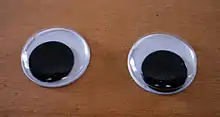 Googly eyes, or wiggle eyes, are small plastic crafting items used to imitate eyeballs. Googly eyes traditionally are composed of a white plastic or card backing covered by a clear, hard-plastic shell, encapsulating a black plastic disk. The combination of a black circle over a white disk mimics the appearance of the sclera and pupil of the eye to humorous effect. The inner black disk is allowed to move freely within the larger clear plastic shell, which makes the eyes appear to move when the googly eyes are tilted or shaken.