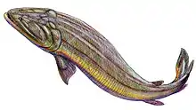 Gooloogongia (/ˌɡʊlʊˈɡɒŋɡiə/ GUU-luu-GONG-gee-ə) is a genus of prehistoric lobe-finned fish which belonged to the group of rhizodont fishes. Gooloogongia lived during the Late Devonian period (Famennian stage, about 360 million years ago).[1] Fossils have been found in the Canowindra site, (Australia).[1] It was named by Dr. Zerina Johanson and Dr. Per Ahlberg in 1998. In general size and shape Gooloogongia is similar to the modern saratoga which lives in the tropical rivers of northern Australia.