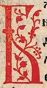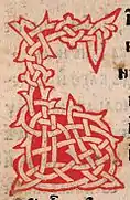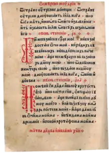 The ornamental headings are printed in red in calligraphic ligatured script with interlaced letters. Especially elaborate are two headings, introducing the Canticles and the Psalms, respectively; they have floral additions in the form of little leaves.[25] The initials used in the psalter can be divided into two groups. The more numerous group comprises 110 initials with slender strokes adorned with graceful foliate tendrils.[24] Their design is based on the decorative tradition of Cyrillic manuscripts, as well as on Renaissance floral motifs.[28] A majority of them are printed from woodcuts created for the 1519 hieratikon. The second group are 39 initials composed of densely intertwined vines. They are larger and look heavier, extending over six to seven lines of text. They are based on initials in the 1508 Wallachian hieratikon. The first part of the Goražde Psalter, comprising the Psalms, is more decorated than the rest of the book. In the first part, the two types of initials are used alternately, most of them printed in red. The rest of the book contains only the initials with slender strokes, and they are rarer, smaller, and simpler than in the Psalms; they are equally printed in black and red.[24]