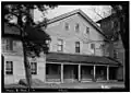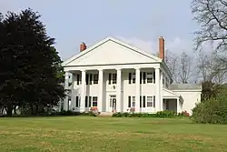 The side elevations of the house have small single-story porches, supported by three Doric columns.[3] A fourth porch spans the rear of the house, connecting the additions, with a rear door similar in detail to the front opening onto the porch.[4] Two more doors access the side porches. A set of three doors opens onto the deck formed by the roof of the rear porch. The windows in the house are double-hung, with six-over-six lights, many of which are original to the house.[4] The roof is covered with asphalt shingling, and a set of low-sloped dormers project to the rear.[3]