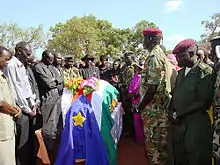 From 2006 and onwards, Muortat became an MP in the South Sudan Legislative Council representing his constituency in Rumbek. In his inaugural speech to the SSLA he reiterated his concerns about the length of the CPA and on tribalism. On 12 April 2008, Muortat died from natural causes while on a recess from parliament-having achieved so much in his life. He was very proud of the SPLA/M achievements especially that the road to the realisation of the Southerner's freedom was within sight.[2] Gordon Muortat was given a state funeral and was laid to rest at Rumbek Freedom Square, attended by thousands of citizens who had come to pay their last respects to a man who was remembered by many as a freedom fighter and defender of the rights of the people of South Sudan. Notable speakers at the occasion were President Salva Kiir Mayardit, Abel Alier; former Vice President of the Republic of Sudan and President of the defunct High Executive Council for Southern Sudan, Isaiah Kulang Mabor, Madam Rebecca Nyandeng De Mabior, Mr. Andrew Makur Thou, Mr. Bona Malual, Mr. Clement Wani Konga and Mr. Daniel Awet Akot, then governor of Lakes State. In his address to the mourning citizens of the South Sudanese town of Rumbek, the President of the Republic of South Sudan, Gen. Salva Kiir Mayardit, reminded the people of the selfless leader, who spent all his life struggling for the cause of the people of South Sudan. "It is now up to us, the present generation to transform Hon. Gordon's dreams into a reality, after achieving the Comprehensive Peace Agreement where the right to Self Determination for the people of South Sudan is enshrined," stated the President. President Kiir declared 3 days of state mourning and all the flags in Lakes State fly at half mast.[17]