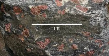 The garnets bear the inclusions in this rock unit, which range from minerals such as acicular rutile, pyrite, plagioclase, pyroxene, hornblende, ilmenite, apatite, and biotite.[5] The most common of these is the acicular rutile.[5] Also shown in the garnets is well-developed tectonic parting.[5]