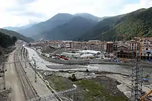 Mount Aibga and the skiing area Gornaya Karusel, in the foreground construction works for the hotel village in Estosadok, July 2013.
