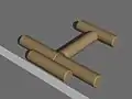 Gorodki (Russian: Городки, townlets; Swedish: Poppi) is an ancient Russian folk sport whose popularity has spread to Karelia, Finland, Sweden, Ingria, Lithuania, and Estonia. Similar in concept to bowling and also somewhat to horseshoes, the aim of the game is to knock out groups of skittles arranged in various patterns by throwing a bat at them. The skittles, or pins, are called gorodki (literally little cities or townlets), and the square zone in which they are arranged is called the gorod (city).