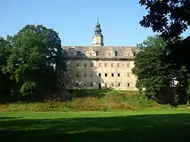 The Castle has historical associations with Cardinal Ernst Adalbert von Harrach (1598–1667), the bishop of Trent, who in his Italian diaries for 1663–1664 refers to Grafenort alternately as Arnsdorff, Arnßdorff, or Arnßdorf,[4] and the composer Ignaz Reimann (1820–1885; buried at the nearby Krosnowice).[5] The poet and actor Karl von Holtei (1798–1880) who began his career as an actor at Grafenort Castle mentions it repeatedly in his pleasantly amusing, light-hearted biography, Vierzig Jahre ("Forty Years").[6] He says he spent thirty years of his life in the Castle; on a return visit he muses about the rooms