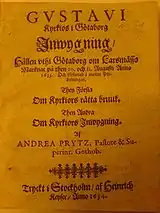 The rectory was completed in 1624,[5] and the construction of a new church on the site of the stave church was announced in 1627. King Gustavus Adolphus created a tax to pay for the work.[6] The initial demand was for a barrel (just over 125 litres) of wheat, oats, barley or rye from each church-owned property in Västergötland province for a three-year period. In a letter to Gothenburg's town council (13 December 1629)[2] the tax was extended for three more years.[7] From 1625 to 1634, construction costs increased to 8,387 Swedish riksdaler.