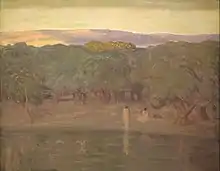 Specializing in landscapes in a muted palette, most scholars count Piazzoni among the Tonalists,[3] and was one of the most influential exponents of this style in California.[4] He sought out the lighting effects of certain times of day, taking a "special interest in full moonrises, the viewing of which became a family ritual. Venturing up a hill, the family would cheer the appearance of the moon. Piazzoni knew the exact time for each moonrise and kept precise records." [5] He was able to portray the essential qualities of a scene and achieve a strong mood, using only minimal descriptive details.[4]