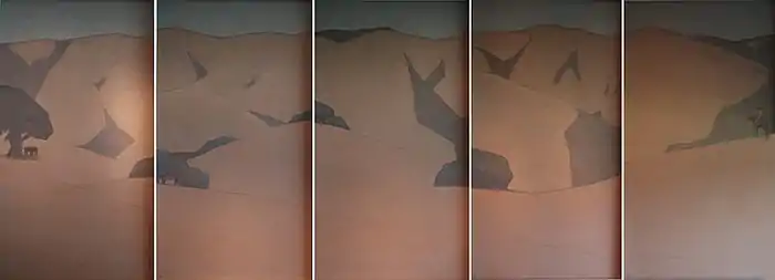 Piazzoni's best-known public work may be his 14 murals for the former headquarters of the San Francisco Public Library for architect George W. Kelham, ten of them dating from 1932, the other four painted in 1945 and not installed until the 1970s.[6] After public debate and lawsuits in the late 1990s, the ten principal murals can now be seen at the M. H. de Young Memorial Museum.
