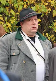 Although no longer in an official leadership position, Küssel has continued to be a prominent figure on the far right and has been a regular speaker at a number of neo-Nazi events, often alongside his long-term collaborator Hans-Jörg Schimanek junior.[11] In February 2005 he was fined €360 for possessing illegal weapons after he was found to own a number of daggers and bayonets, which contravened a weapons ban placed on him in 1982.[12] He was arrested again in 2010 after giving the Hitler salute in a Vienna bar and attacking its Venezuelan-born female owner with an umbrella.[13]