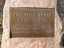 Kunth was buried, according to his wishes, near the tomb of the Humboldt family on the grounds of Tegel Castle. A plaque commemorating Kunth was placed at the entrance to Tegel Castle in 1993. Since January 2006, Kundtanger, a street in the Falkenberg locality of Berlin's Lichtenberg borough, has been named for him.[1] The street is located in the development Wohnen am Gehrensee, where several streets bear the names of friends and associates of the Humboldt family.