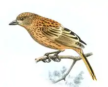 The Gough finch was formally described in 1904 by the British ornithologist William Eagle Clarke from a specimen collected on Gough Island in the South Atlantic. Clarke coined the binomial name Nesospiza goughensis.[2] The Gough finch is now the only species placed in the genus Rowettia that was introduced in 1923 by the English ornithologist Percy Lowe.[3][4] The genus name was chosen to honour John Quiller Rowett, an English businessman and the sponsor of the Shackleton–Rowett Expedition.[5] The Gough finch was traditionally considered to be a bunting in the family Emberizidae,[6] but molecular phylogenetic studies have shown that it is a member of the subfamily Diglossinae in the tanager family Thraupidae and is sister to a clade containing birds in the genus Melanodera.[7] The species is monotypic: no subspecies are recognised.[4]