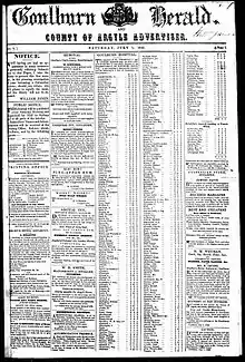 The newspaper was first published on Saturday, 1 July 1848 by William Jones[1] and it passed through a number of name changes in subsequent years until it was absorbed into a competitor, The Southern Morning Herald which was later absorbed into the Goulburn Evening Penny Post. The editor of the Maitland Mercury, another N.S.W. newspaper, described the first issue of the Goulburn Herald as "one of the best first numbers we remember to have seen, inasmuch as it contains a very good amount of local news, a couple of leaders on the topics of the day, and a creditable selection of other matter”.[2] In 1850, the Goulburn Herald was one of only four newspapers published in provincial New South Wales, the area known as the Middle District, N.S.W. also included Brisbane at that time.[3]