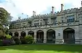 Government House is a Gothic Revival two-storey building with crenellated battlements, turrets, detailed interiors, extensive cellars and a porte-cochère at the entrance. An open cloister on the east elevation forms a verandah room which is supported by Gothic arches and forms an open balcony above.[1] The ground floor contains twelve rooms and the first floor contains thirteen bedrooms. It is built of stone with a slate roof, timber floors, unpainted cedar joinery and a stone-flagged verandah. There are extensive staff offices and quarters.[1]